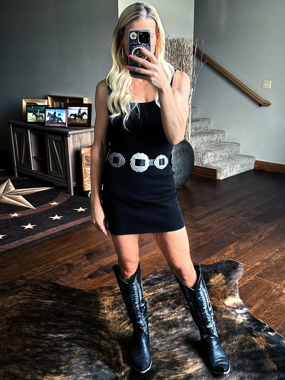 Add some Western flair to your wardrobe with our full concho Genuine Leather Belt. Featuring a silver floral buckle and 7 sliding conchos on a 100% cow leather strap. Customize the look by adjusting the conchos to your liking. Cute and functional, perfect for any cowgirl.