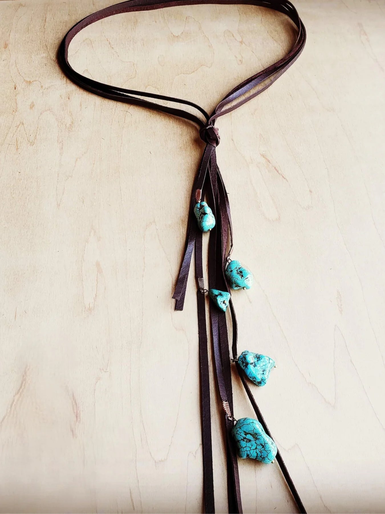 Embrace boho chic elegance with this handcrafted brown leather lasso necklace, featuring genuine turquoise bead accents. This versatile piece brings natural sophistication to any outfit, blending classic western style with contemporary bohemian flair.