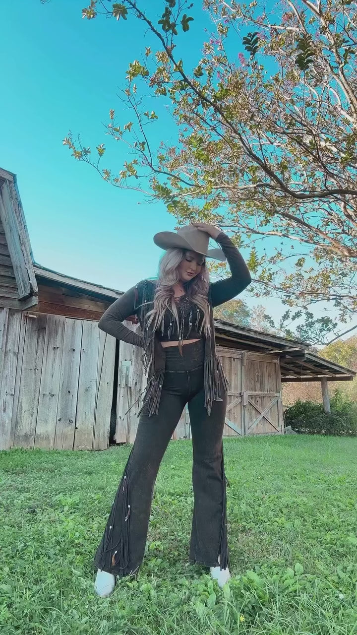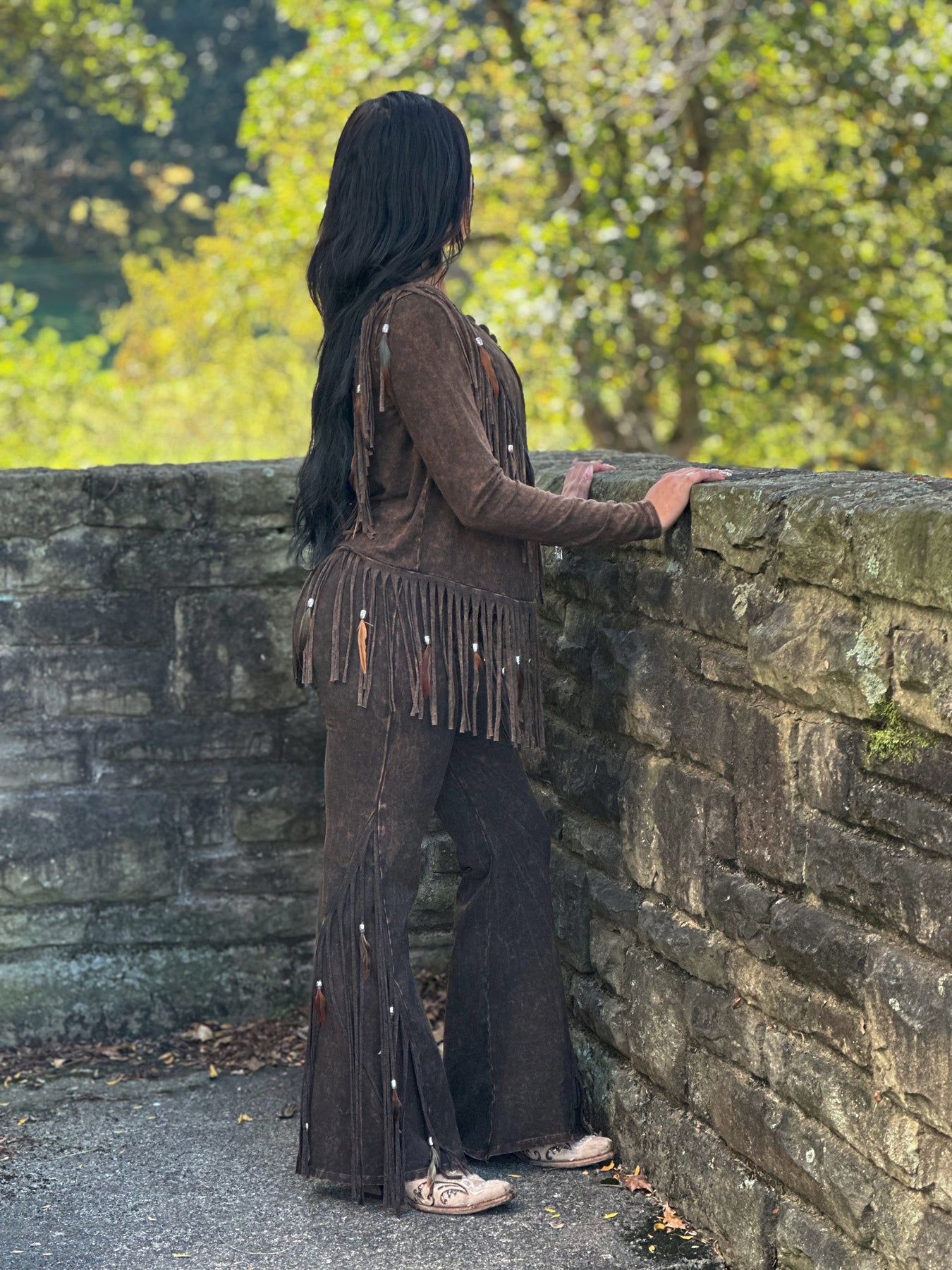 Experience elevated western fashion with this one-of-a-kind mineral wash fringe and feather leggings that commands attention. The unique mineral wash process transforms the fabric into a stunning leather-look finish while maintaining the ultra-soft, stretchy comfort of premium rayon and spandex blend.