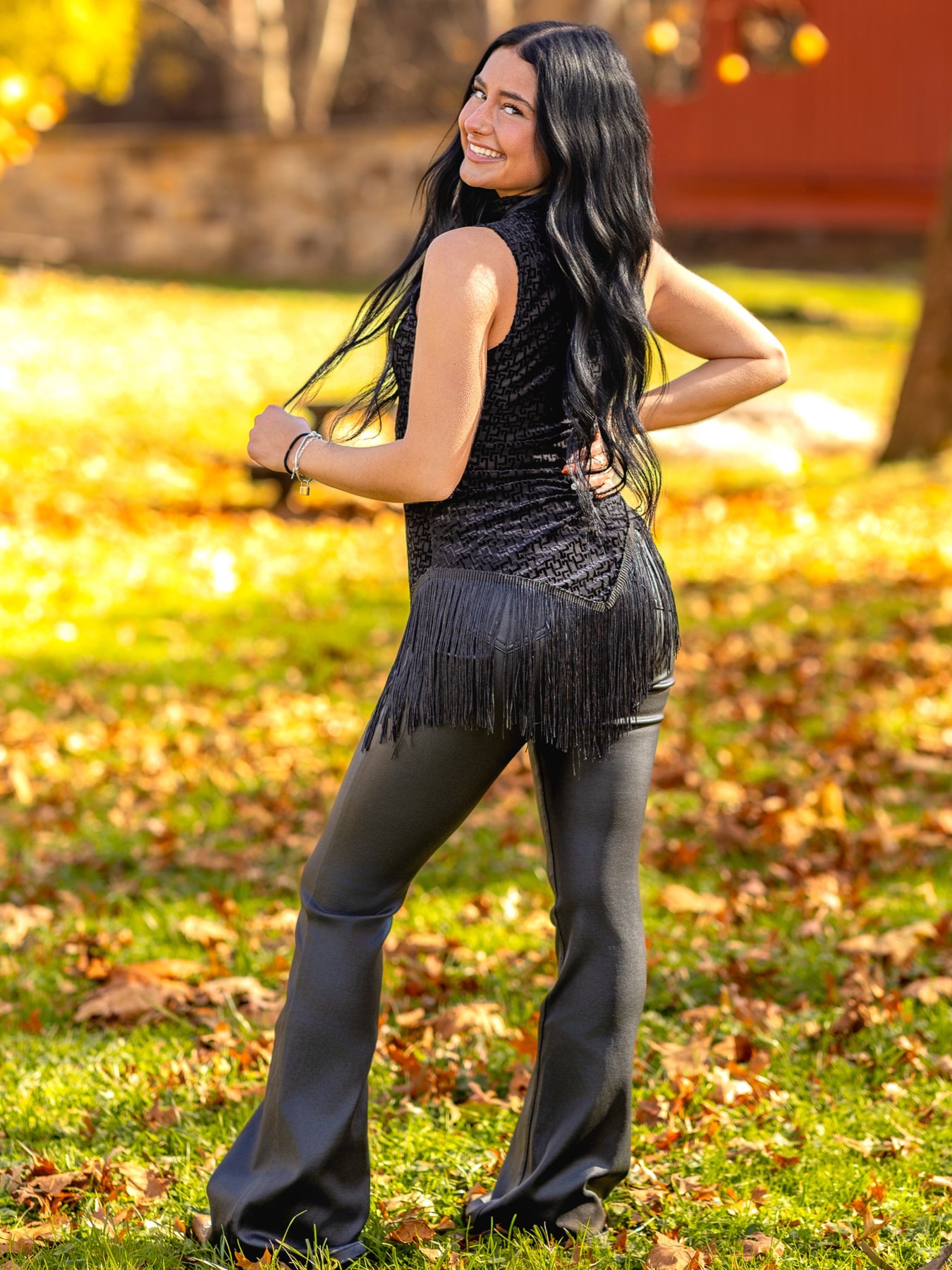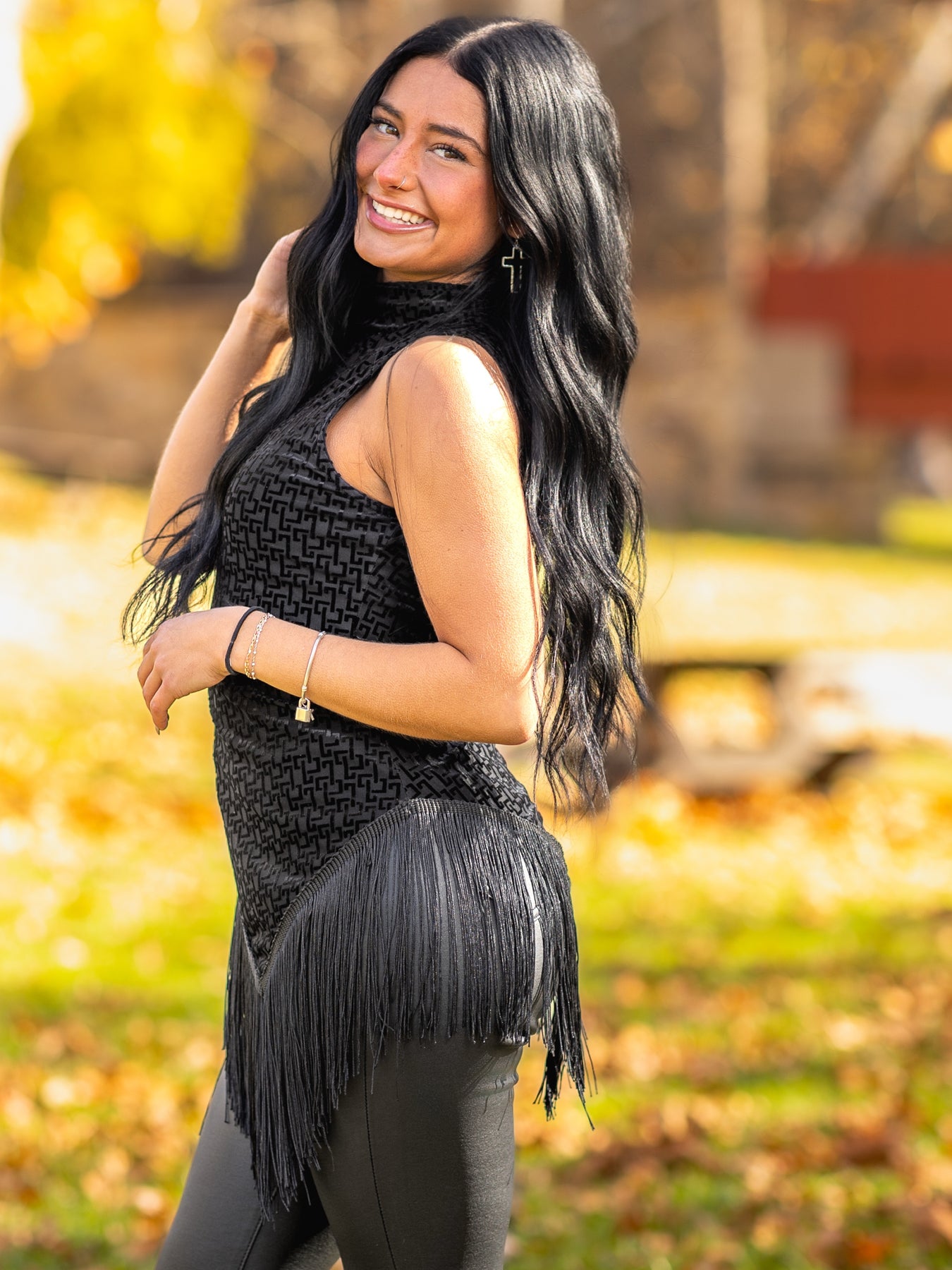 The asymmetric hemline creates modern architectural interest, with the uneven cut adding dynamic movement to the silhouette. Strategic fringe detailing is incorporated throughout the design, adding textural dimension and movement