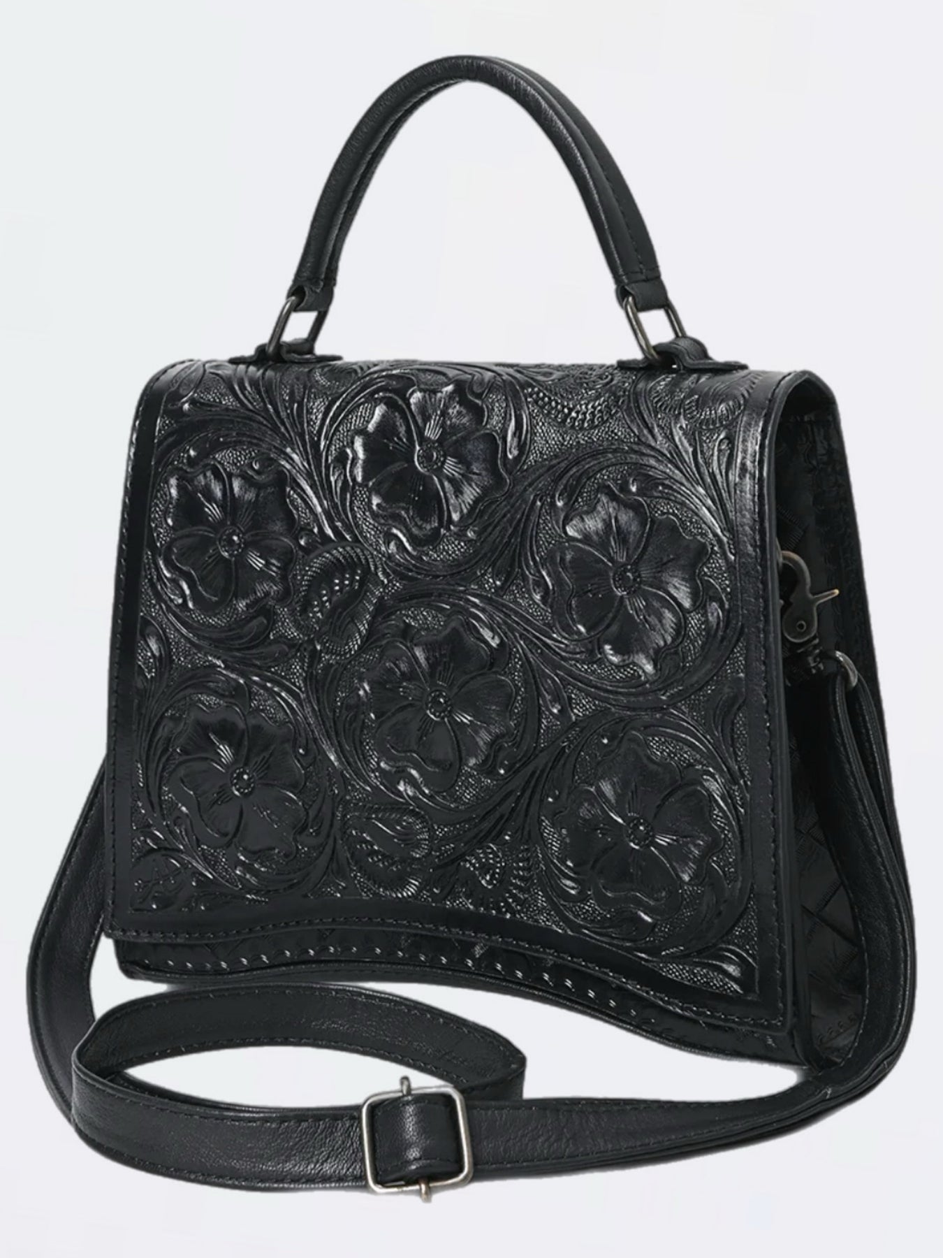 Black Hand Tooled Leather Crossbody Messenger Handbag