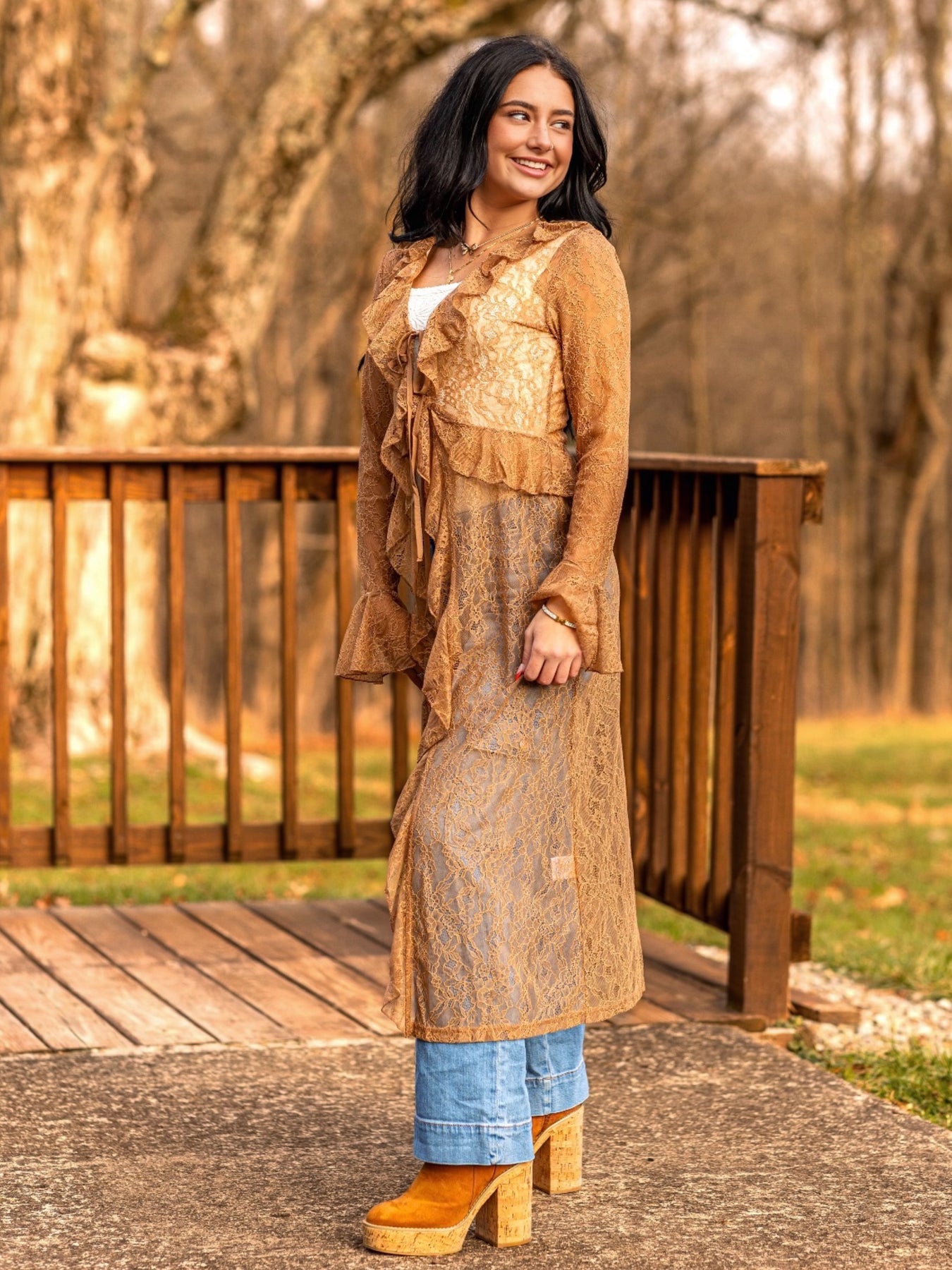Introducing the ultimate Western-boho layering essential: a whimsical lace cardigan that blends vintage femininity with contemporary prairie-chic style. This lightweight sheer lace duster cardigan features a delicate floral pattern and romantic silhouette designed to elevate any outfit with effortless bohemian charm.