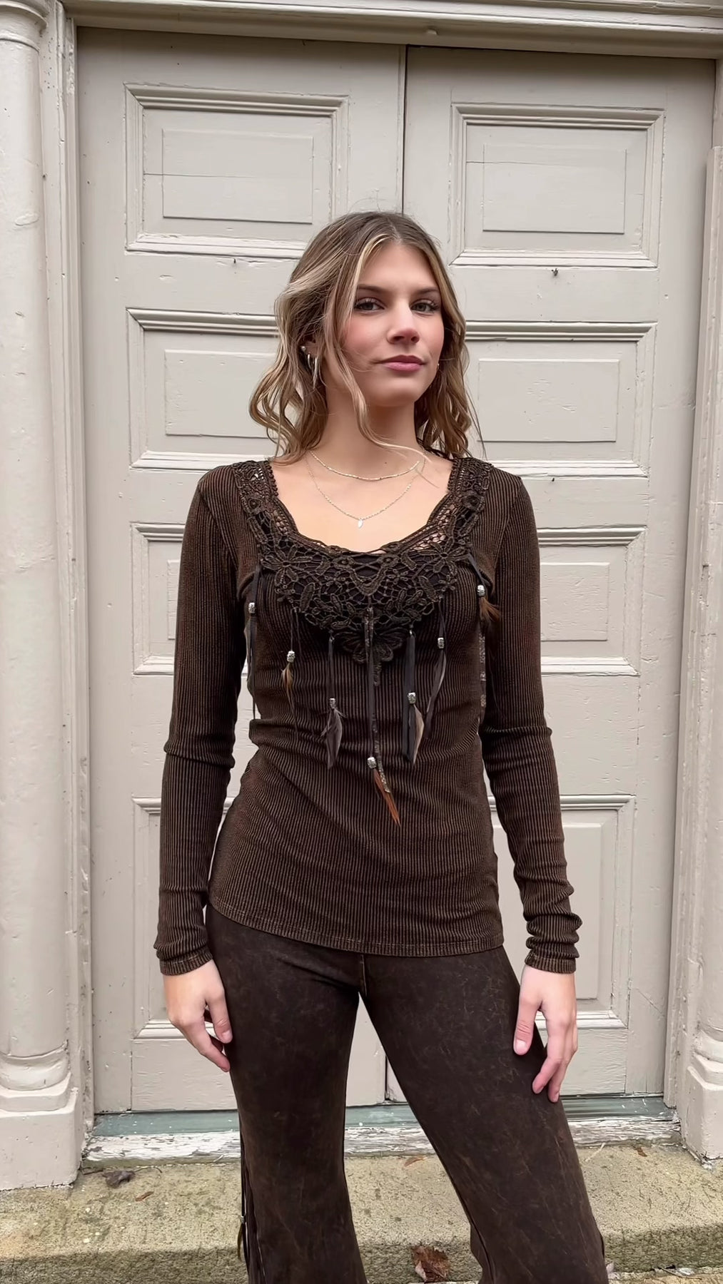 Elevate your wardrobe with this one-of-a-kind designer corduroy top, crafted from premium super-soft and stretchy cotton corduroy that moves with your body. This exclusive piece features an exquisite combination of intricate lace detailing, delicate fringe trim, and authentic feather accents that create an effortlessly luxe western boho aesthetic.