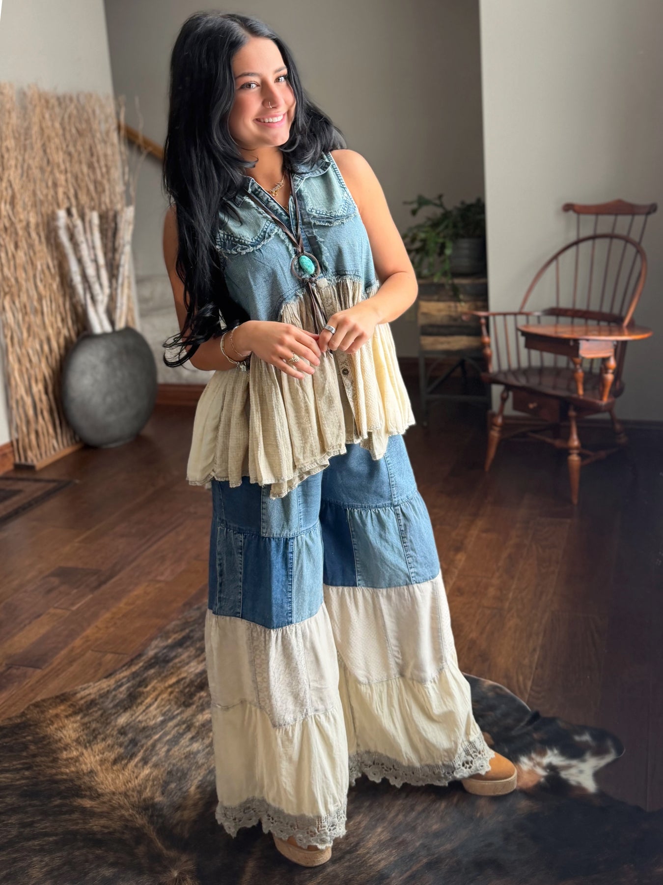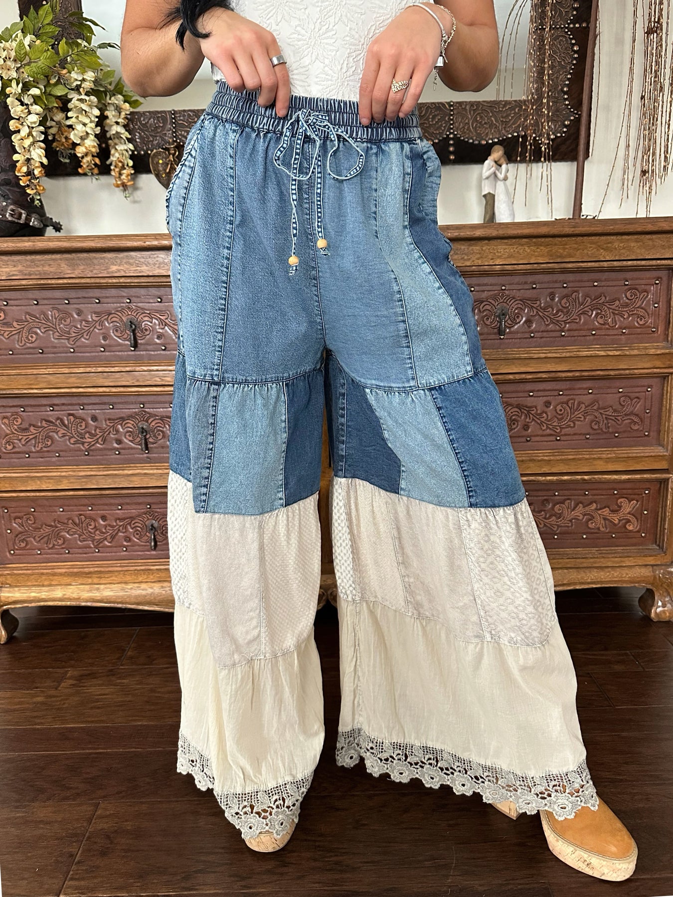 • Wide-leg tiered silhouette with mixed fabric patchwork panels offering a distinctive boho-aesthetic