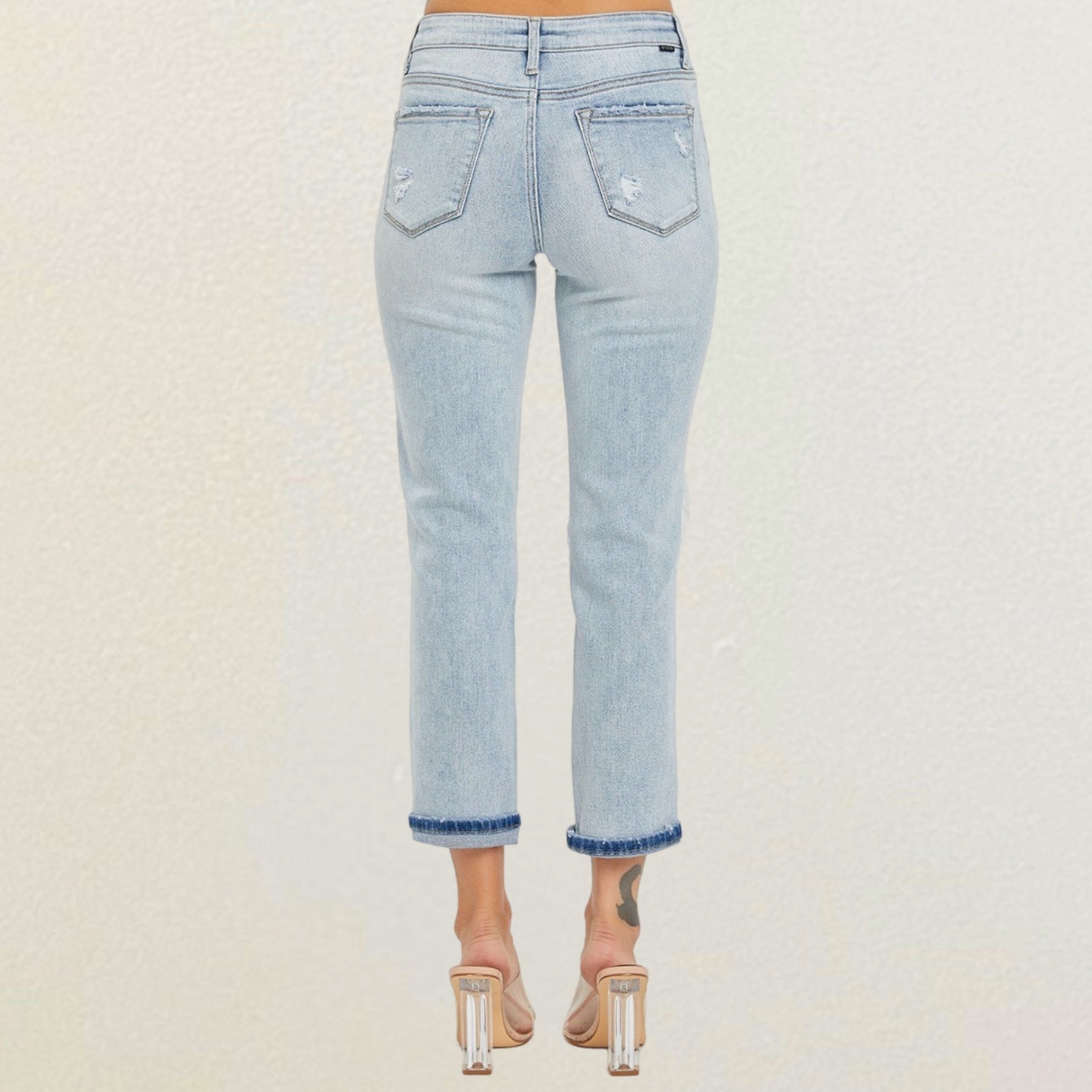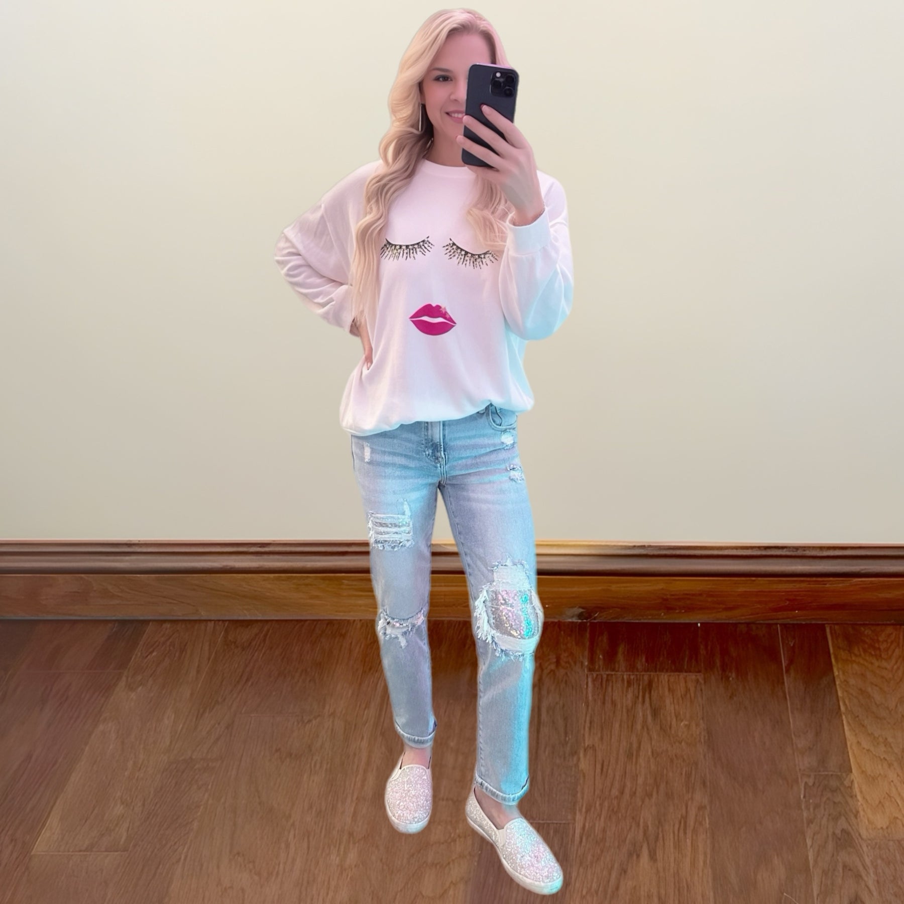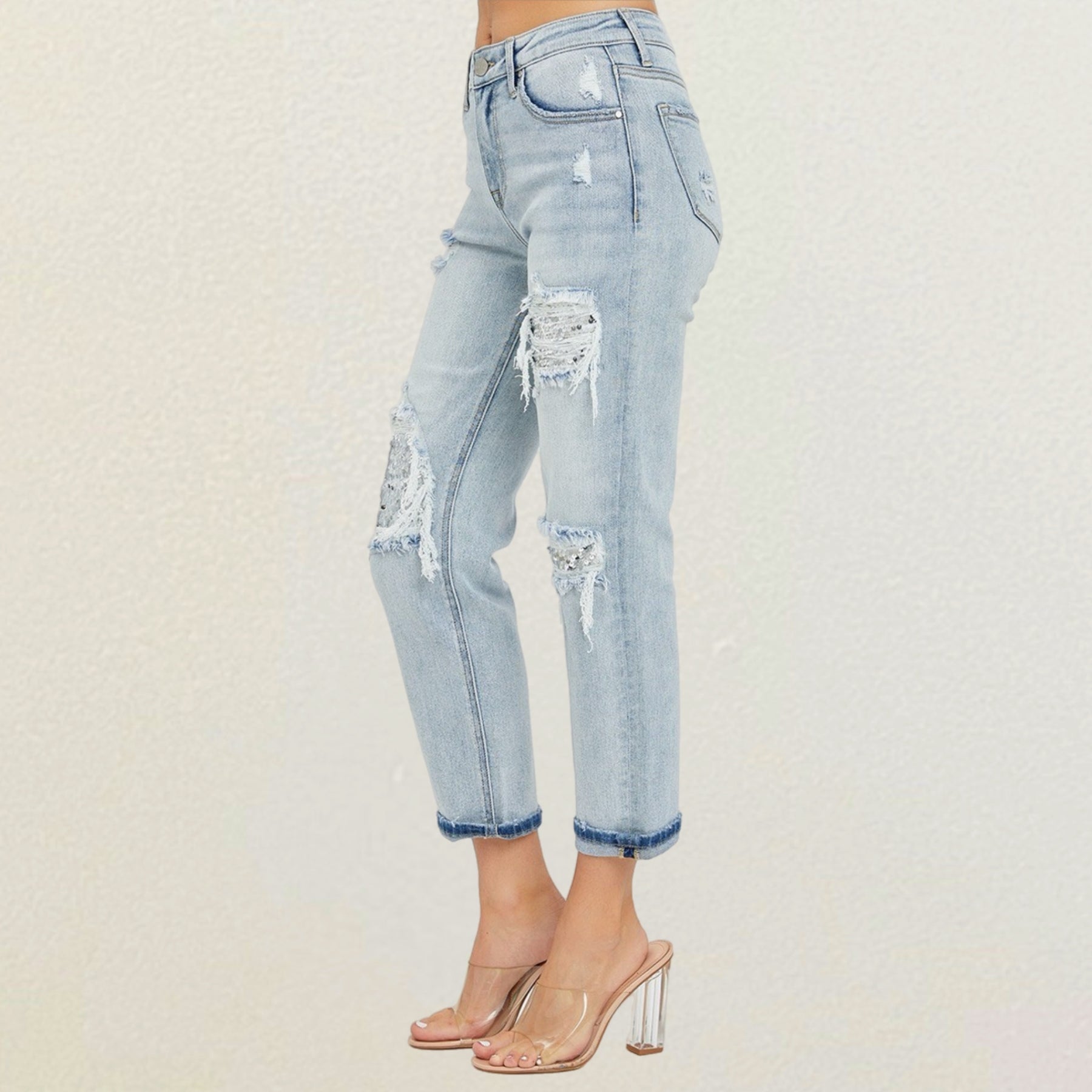 Upgrade your denim game with our Risen MIDRISE SEQUINS PATCHED TAPERED JEANS. Made with soft and stretchy fabric, these jeans offer comfort and style. The trendy sequin patches add a cute touch to a classic design. Perfect for any occasion, these jeans are a must-have for your wardrobe.