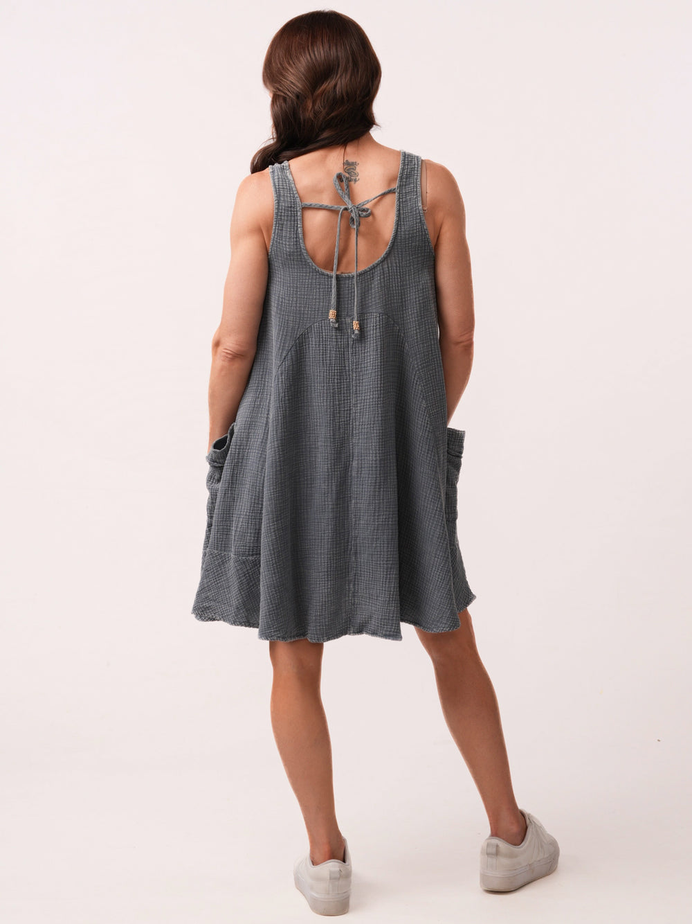 Effortlessly chic and comfortable, our Cotton Gauze Mineral Washed Dress is a must-have for any wardrobe. This sleeveless dress features thick straps, side pockets, and a slight sharkbite hem, adding both style and convenience. The beaded tie closure in the back not only adds a touch of detail but also allows for a customizable fit. With its lightweight and swingy design, this dress offers both a relaxed and loose fit, making it perfect for any occasion.