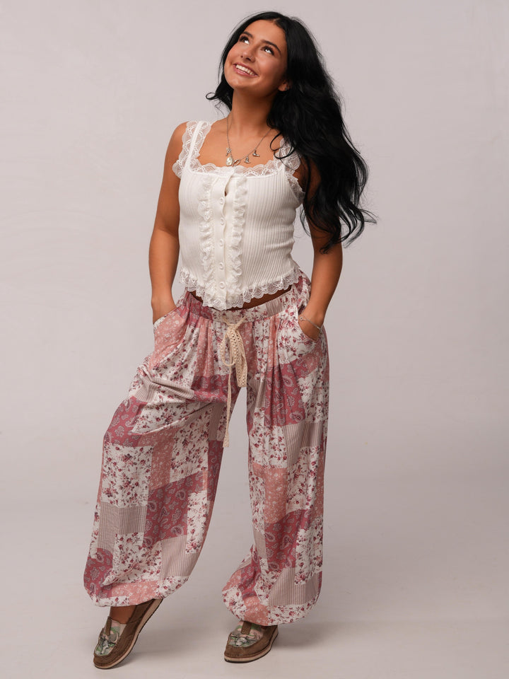 Experience both style and comfort with our printed woven pants! Designed with a relaxed fit, these pants feature a trendy tie detail and a classic pointed striped pattern. Perfect for any occasion, these pants will keep you looking and feeling your best.