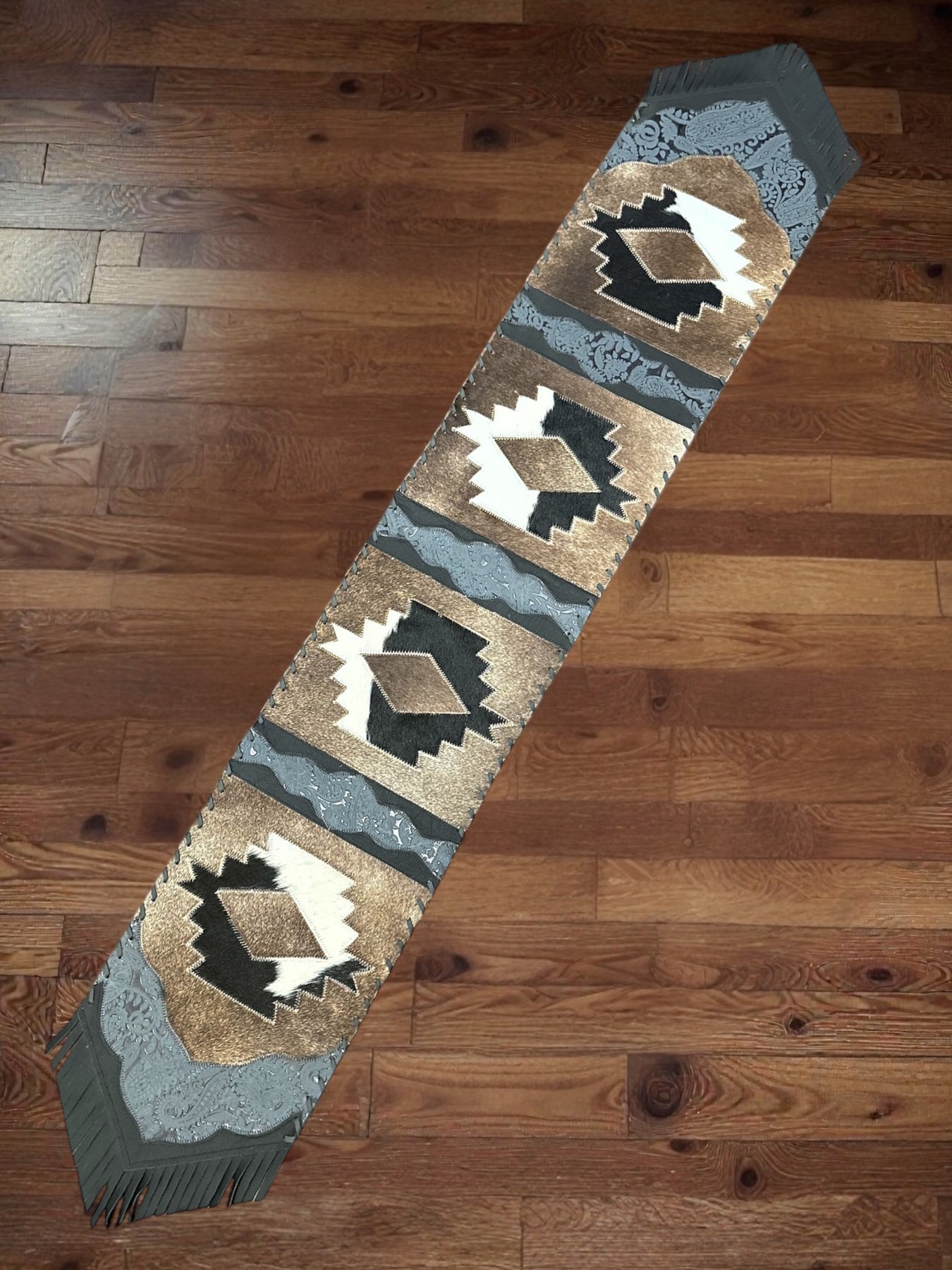 Premium Cowhide Embossed Mesa Table Runner with Fringe