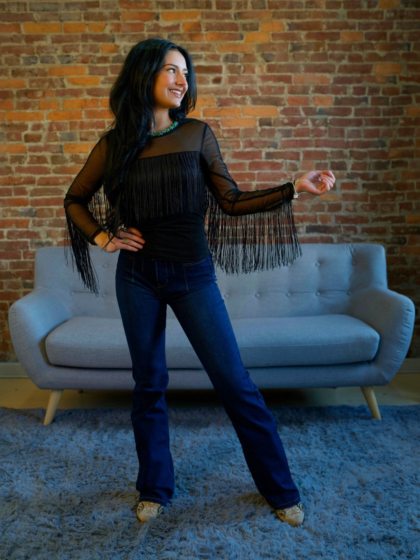 Turn heads at your next music festival or concert with this stunning black long sleeve mesh fringe top, featuring cascading fringe detailing and sheer mesh construction for an edgy yet feminine western aesthetic.[1][3] Perfect for layering over bodysuits or wearing as a statement piece, this versatile top combines boho-chic flair with festival-ready edge.