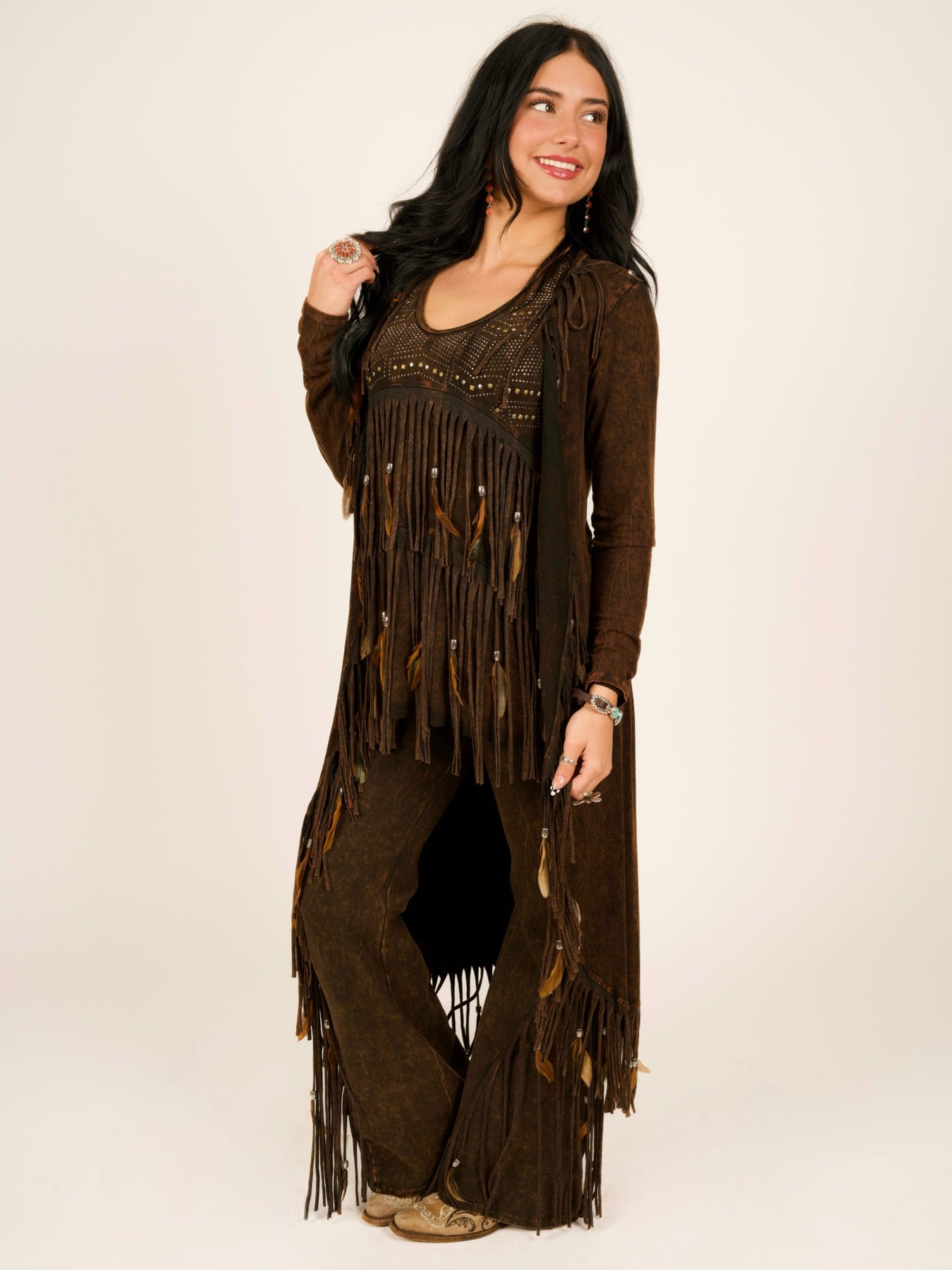 Experience elevated western fashion with this one-of-a-kind mineral wash fringe and feather duster that commands attention. The unique mineral wash process transforms the fabric into a stunning leather-look finish while maintaining the ultra-soft, stretchy comfort of premium rayon and spandex blend.