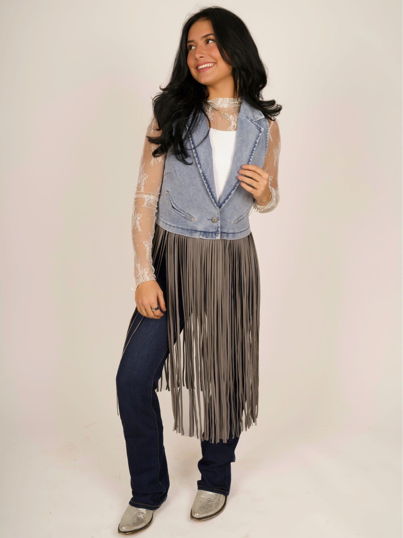 A structured denim fringe vest with classic Western appeal. This sleeveless piece features a pointed collar, button-down front, and open design ideal for layering over tanks, blouses, or dresses. The standout detail is the full-length faux suede fringe cascading from the waistline to mid-calf, creating dramatic movement and authentic cowgirl style. Stud detailing across the upper back yoke adds rustic character, while the medium wash denim delivers timeless Western authenticity.