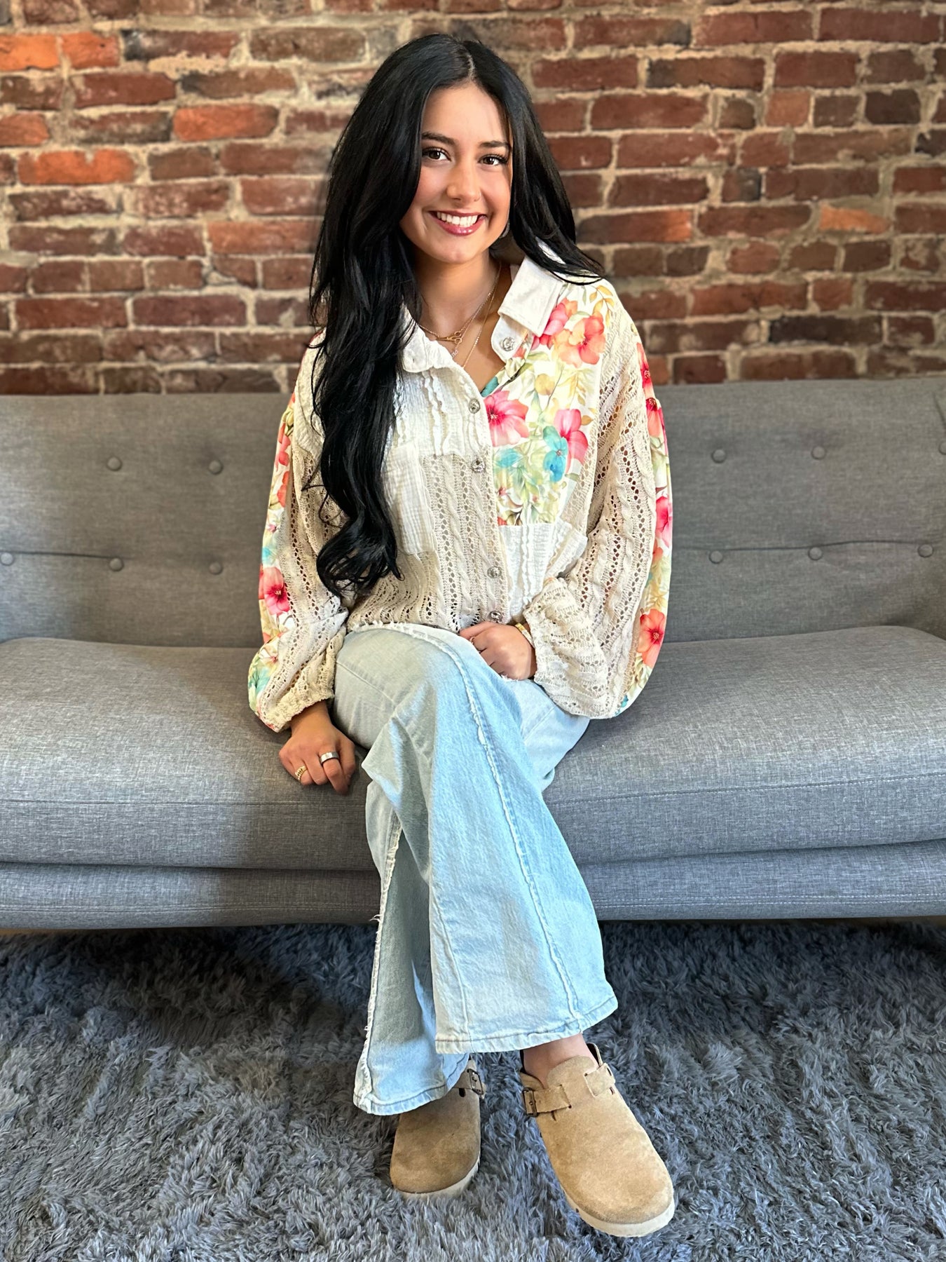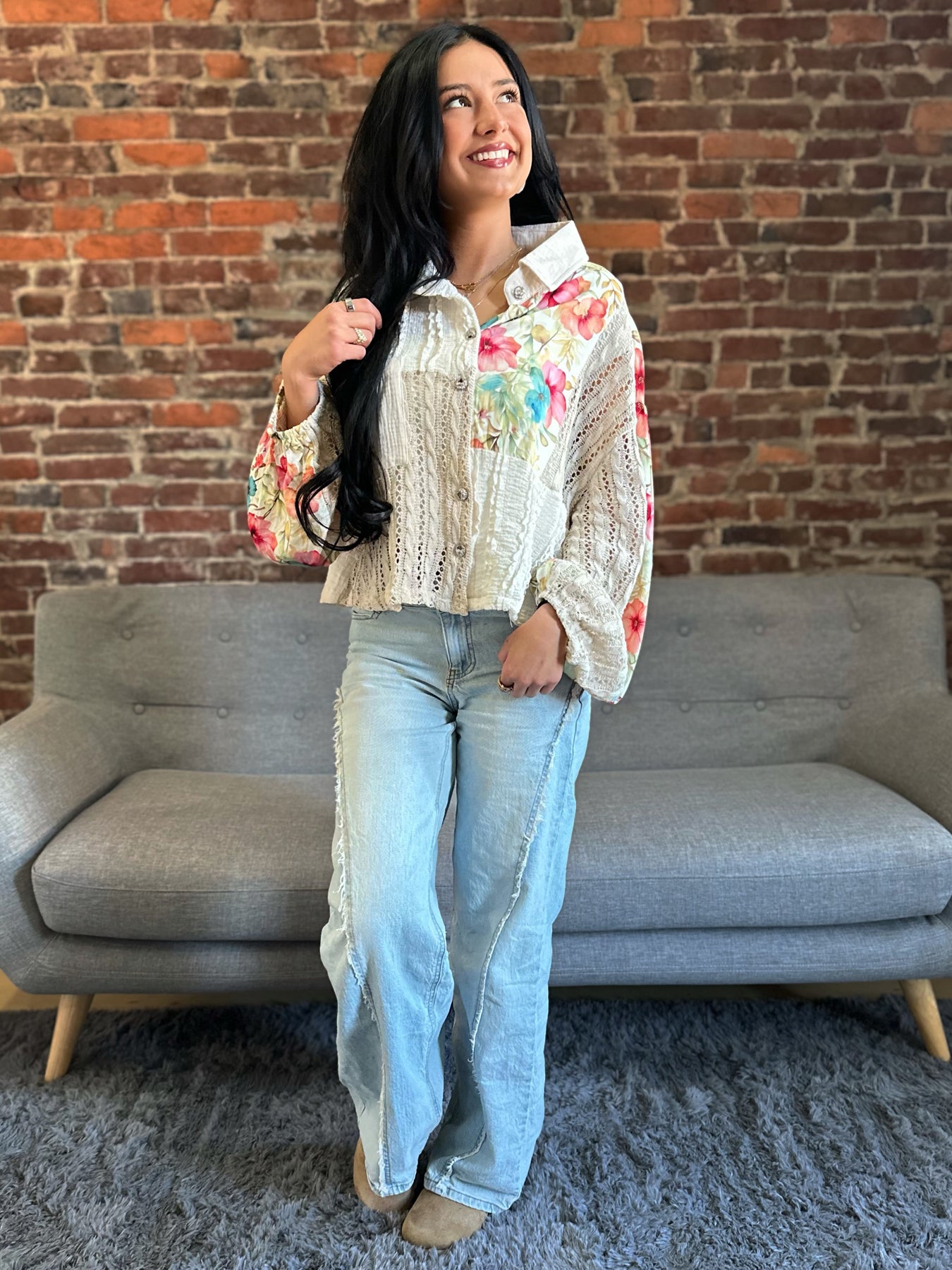 POL Mixed Bloom Floral Crochet Button Up