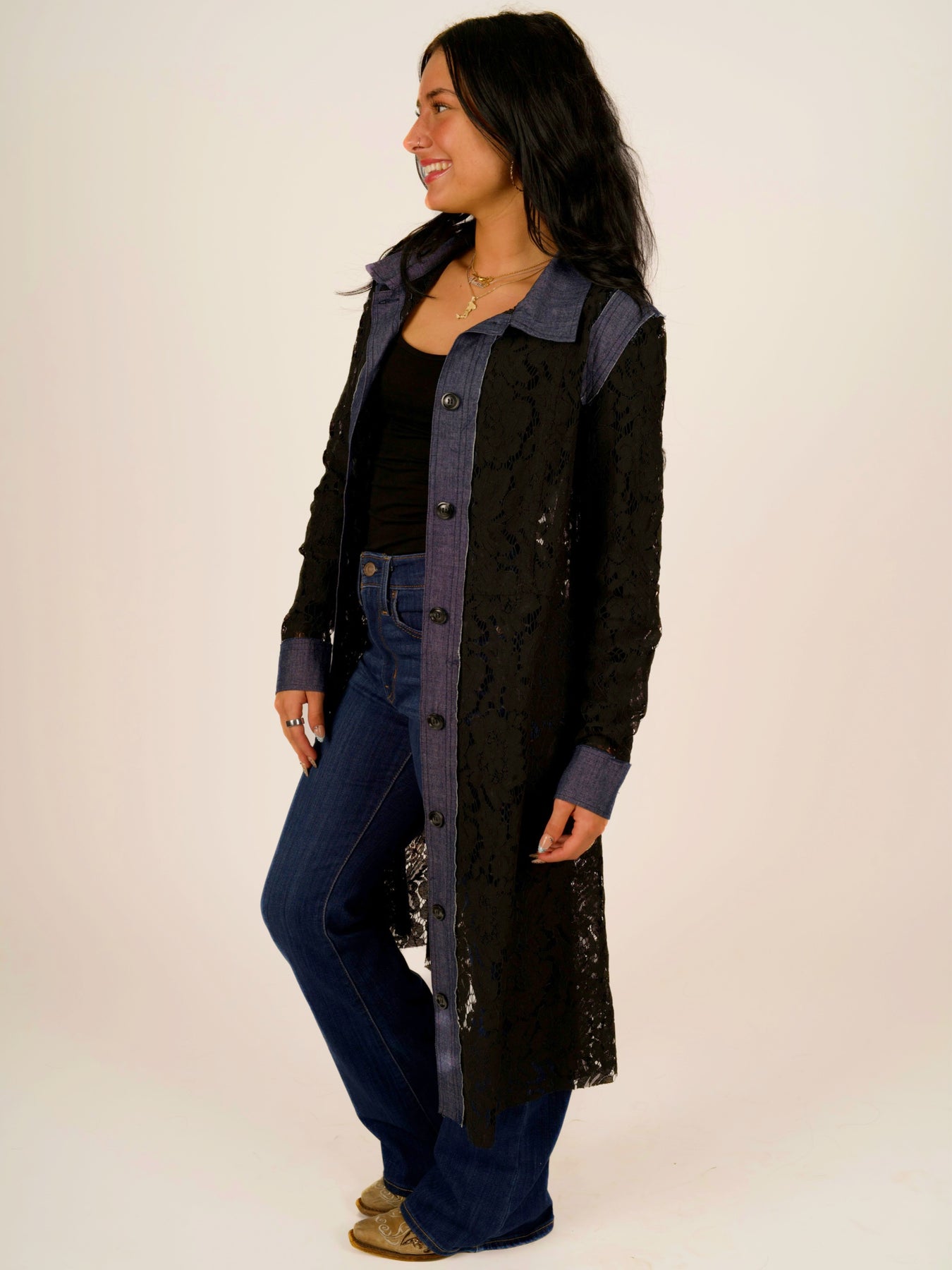 Transform your wardrobe with this stunning long-line lace jacket—a sophisticated fusion of delicate femininity and contemporary edge. Featuring an eye-catching contrast of luxurious black lace and durable denim trim, this lace trim jacket delivers the perfect balance of romance and modern chic styling.
