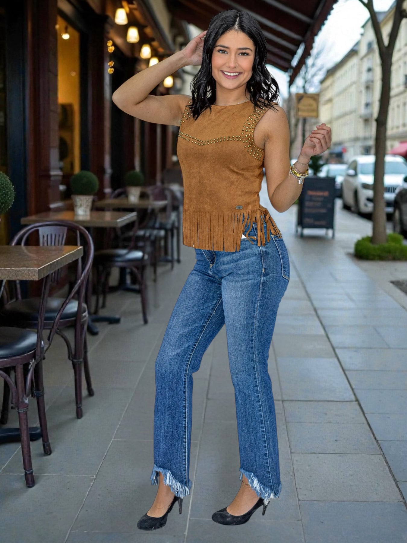 Turn heads in this brown suede sleeveless tank top. Featuring antique brass-tone studs along the front yoke and arm openings, this structured top delivers edgy sophistication perfect for rodeo nights, country concerts, and bold layering looks.
