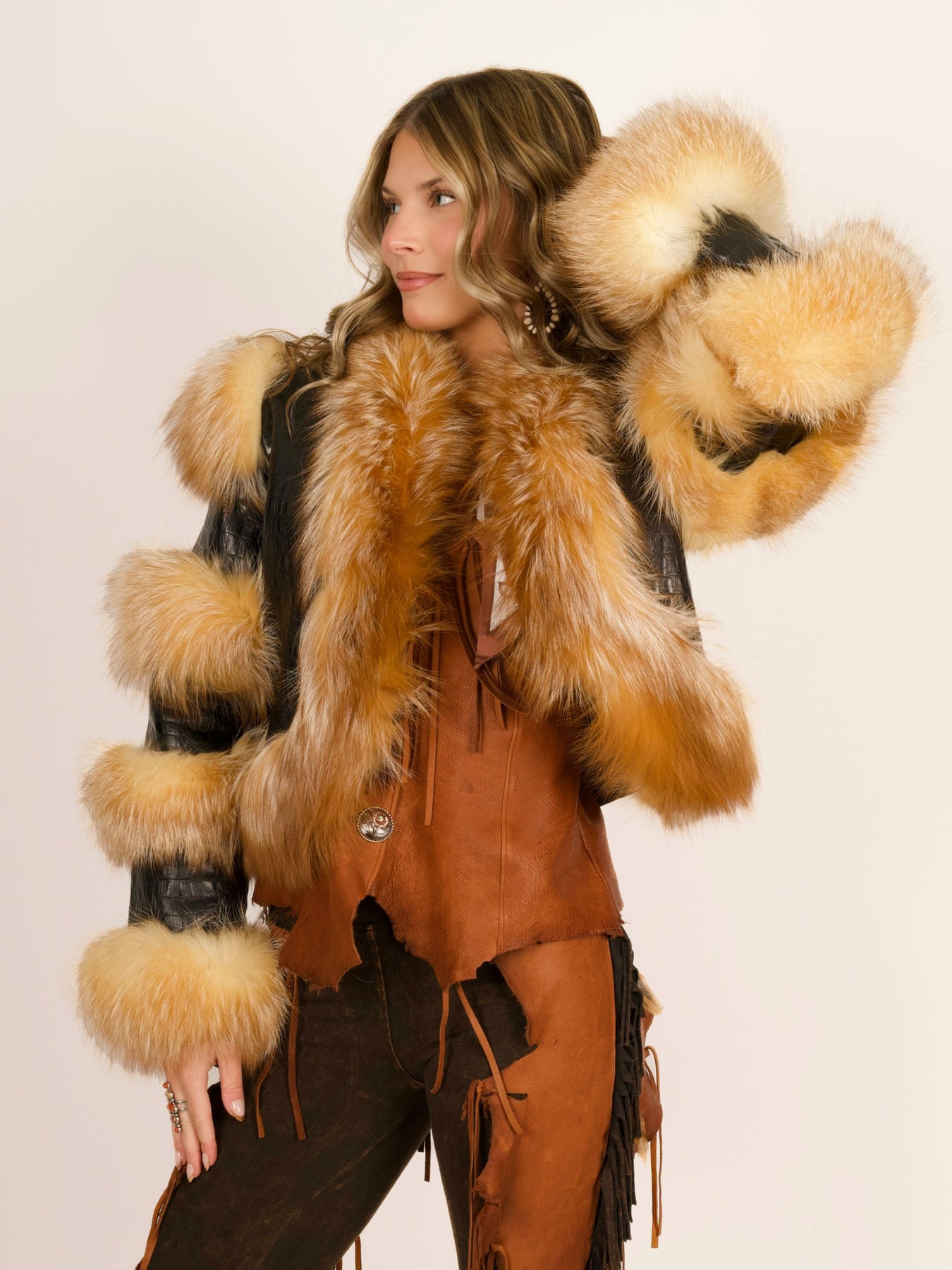 Elevate your wardrobe with this one-of-a-kind designer rockstar jacket—where western luxury meets edgy streetwear style. Handcrafted from premium gator-stamped lamb leather with luxe fox fur accents, this statement piece delivers rock-and-roll attitude with haute couture sophistication.