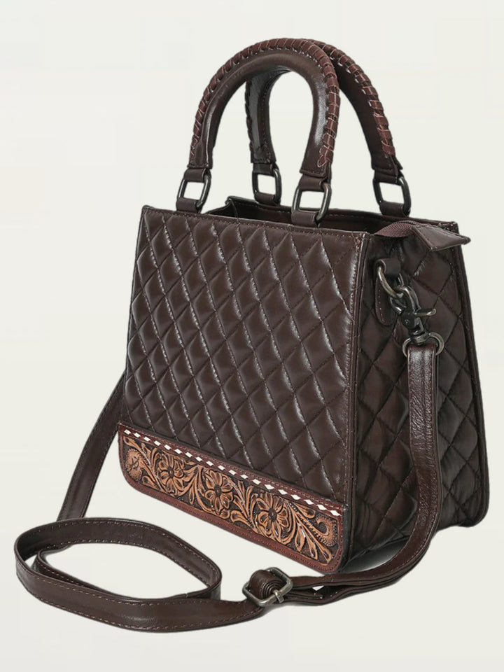 • Hand-tooled floral leather accent in natural tan along the bottom edge