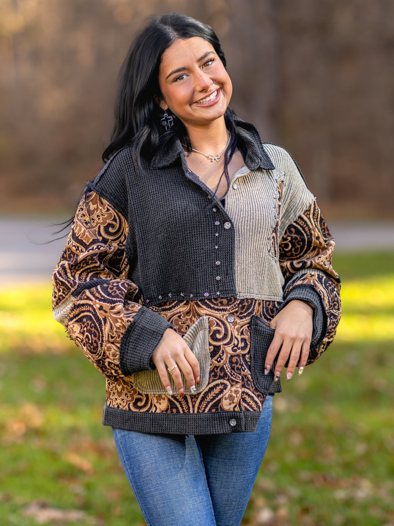 Elevate your boho wardrobe with this show-stopping POL oversized jacket featuring dramatic balloon sleeves that make a bold statement. This versatile layering piece combines comfort with edge, perfect for transitional weather and festival season style.